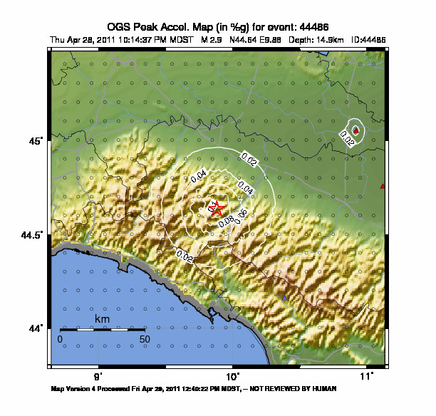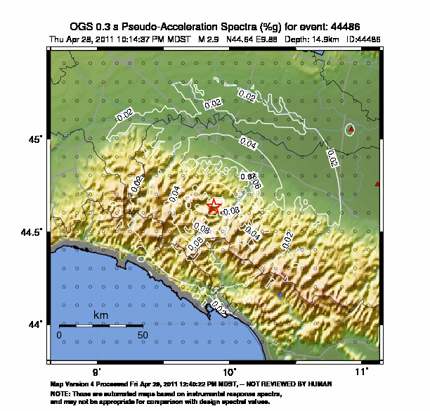 The map shows the latest 100 earthquakes (brown markers) occurred in the area around the epicenter (30 km radius) and the earthquakes with magnitude greater than 3.8 (purple marker, if any) occurred since 1977. Click on each event for details. Furthermore, it is possible to download .kml and .csv files including all events recorded by us in the area around the epicenter (30 km radius), since 1977. export in csv format export in kml formatCaption