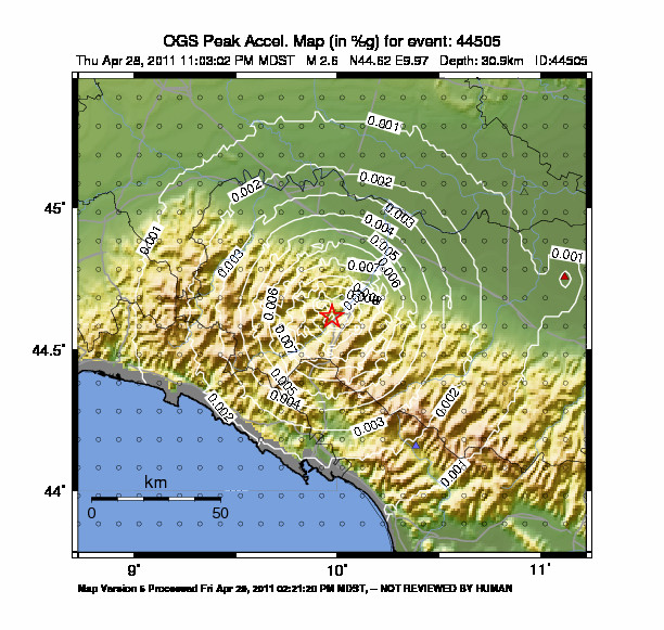 The map shows the latest 100 earthquakes (brown markers) occurred in the area around the epicenter (30 km radius) and the earthquakes with magnitude greater than 3.8 (purple marker, if any) occurred since 1977. Click on each event for details. Furthermore, it is possible to download .kml and .csv files including all events recorded by us in the area around the epicenter (30 km radius), since 1977. export in csv format export in kml formatCaption