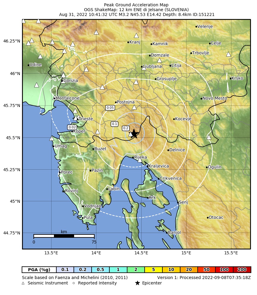The map shows the latest 100 earthquakes (brown markers) occurred in the area around the epicenter (30 km radius) and the earthquakes with magnitude greater than 3.8 (purple marker, if any) occurred since 1977. Click on each event for details. Furthermore, it is possible to download .kml and .csv files including all events recorded by us in the area around the epicenter (30 km radius), since 1977. export in csv format export in kml formatCaption