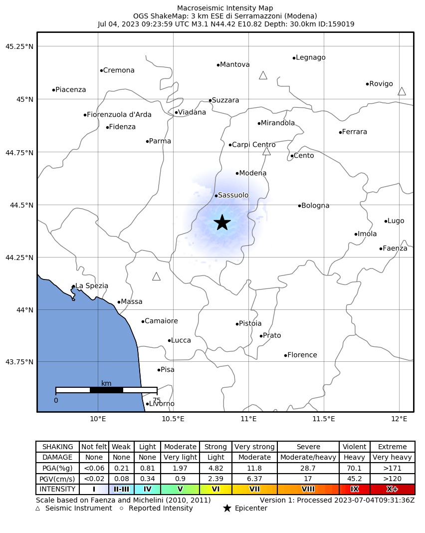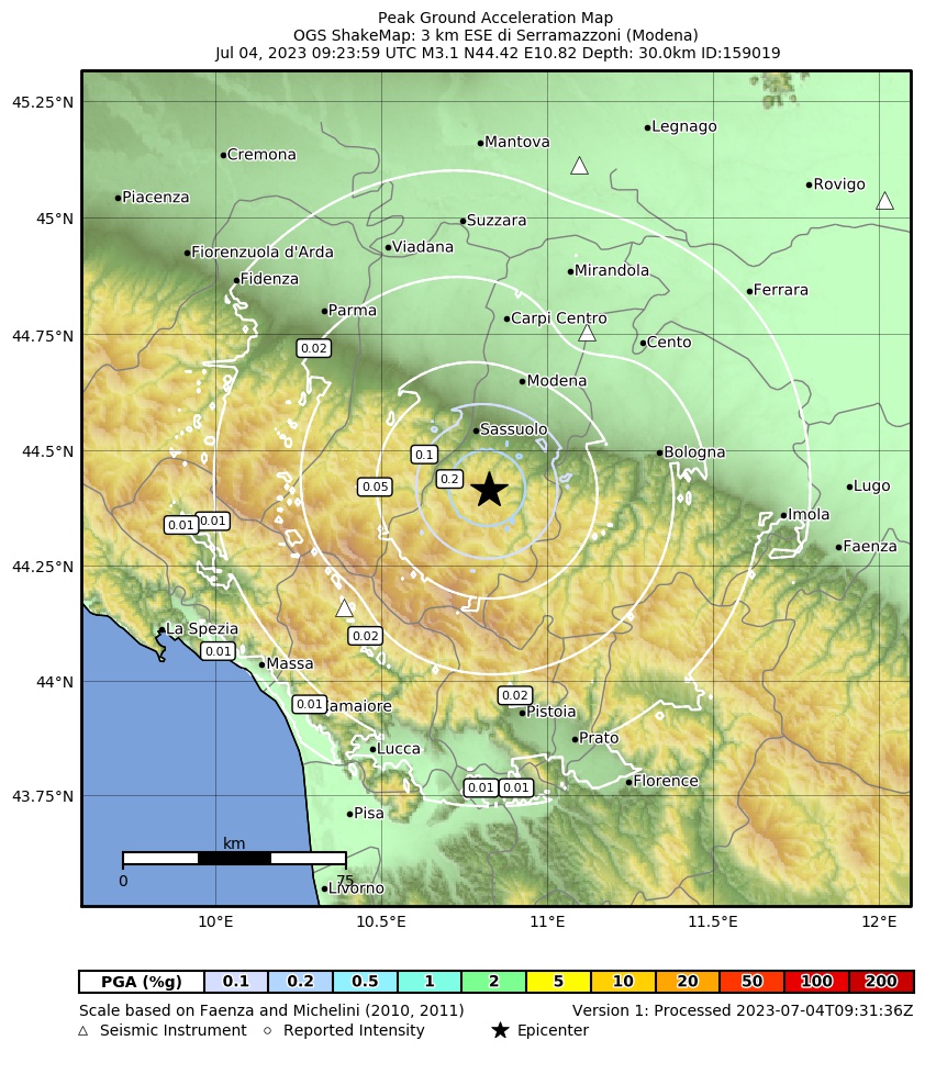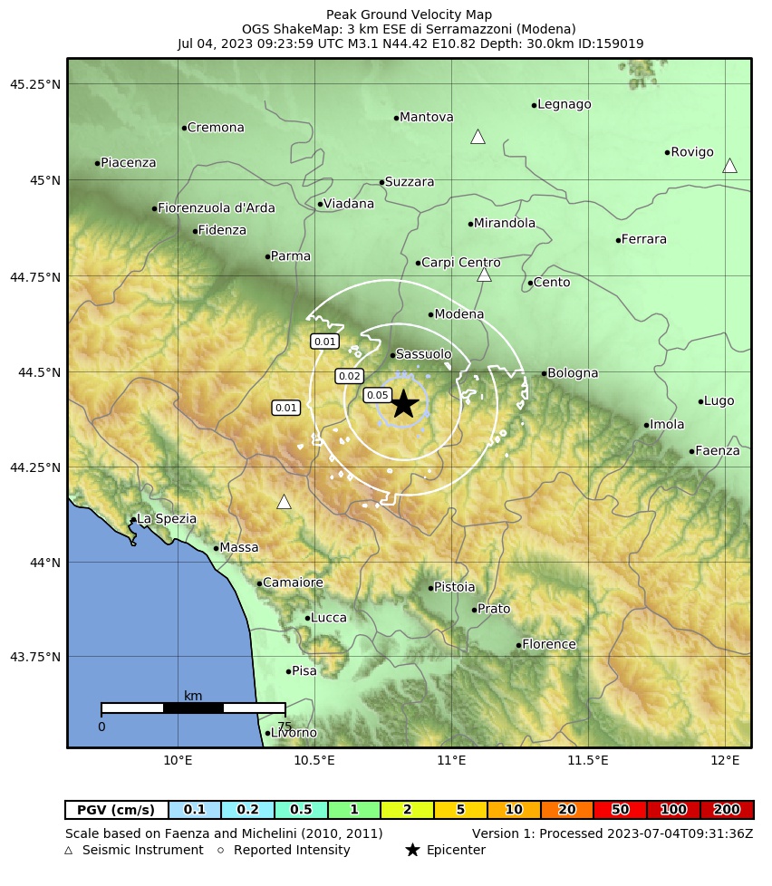 La mappa mostra gli ultimi 100 terremoti (simboli marrone) localizzati entro 30 km dall'epicentro e gli eventi con magnitudo maggiore di 3.8 (con simbolo viola, se presenti) localizzati dal 1977 nella stessa area. Clicca su ogni evento per dettagli. È inoltre possibile scaricare il file .kml o .csv con tutti gli eventi da noi registrati, entro 30 km dall’epicentro, a partire dal 1977. export in csv format export in kml formatLegenda
